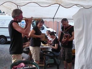Participation des musiciens pour une animation danse au moment des changements de plateaux d’un grand bal trad organisé par la MJC D’Oust.