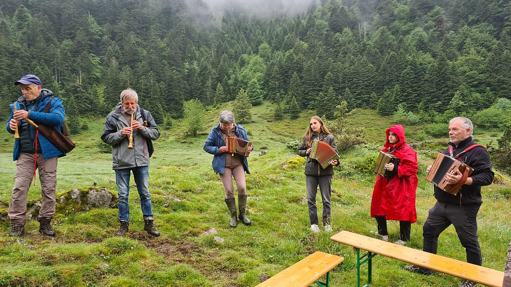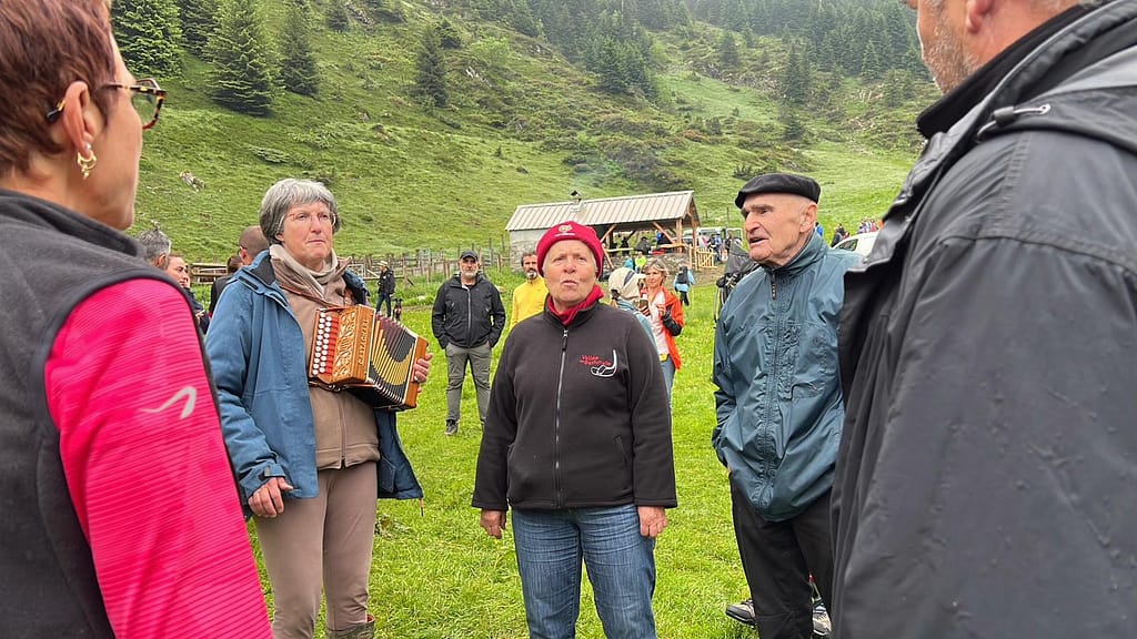 Animation à l’occasion de la transhumance à Campuls. Nous fêtons l’arrivée en estive des chevaux, des vaches et des brebis. Le temps était plus clément que l’année dernière mais ne nous a tout de même pas parmi de mettre nos costumes. Beaucoup de monde encore cette année.