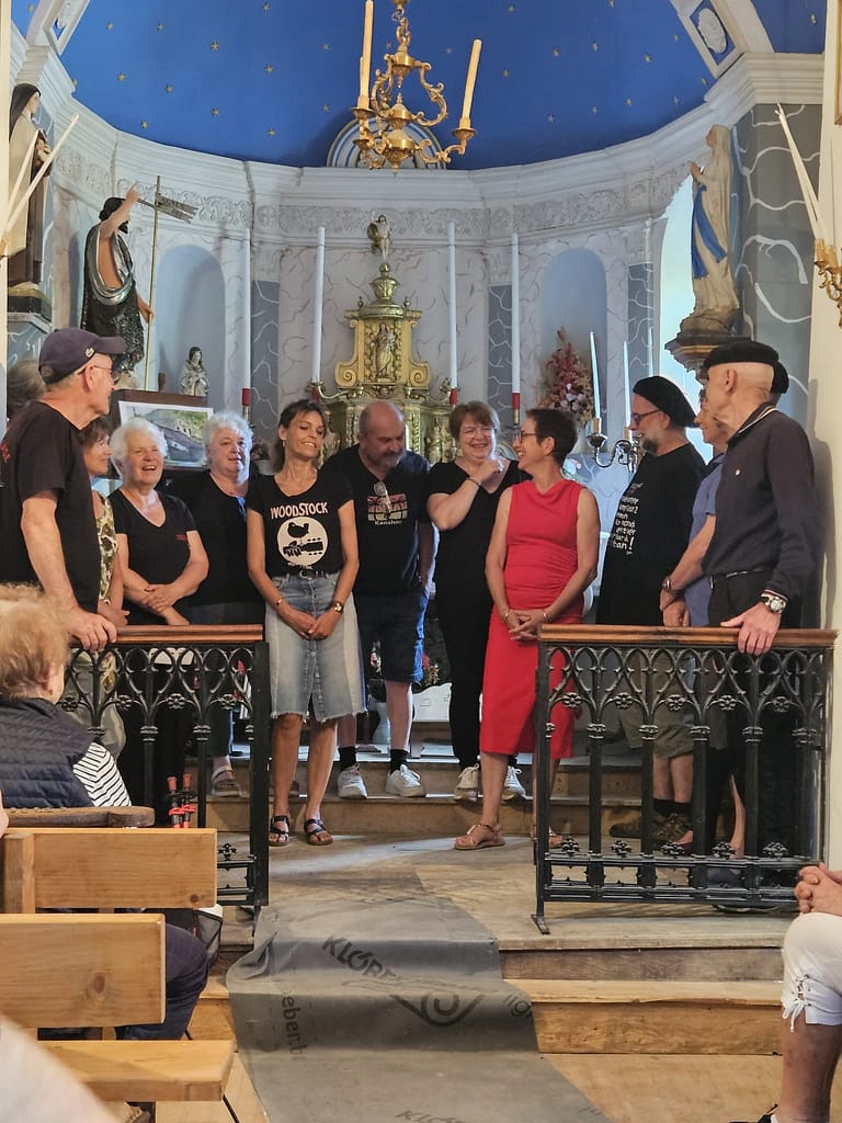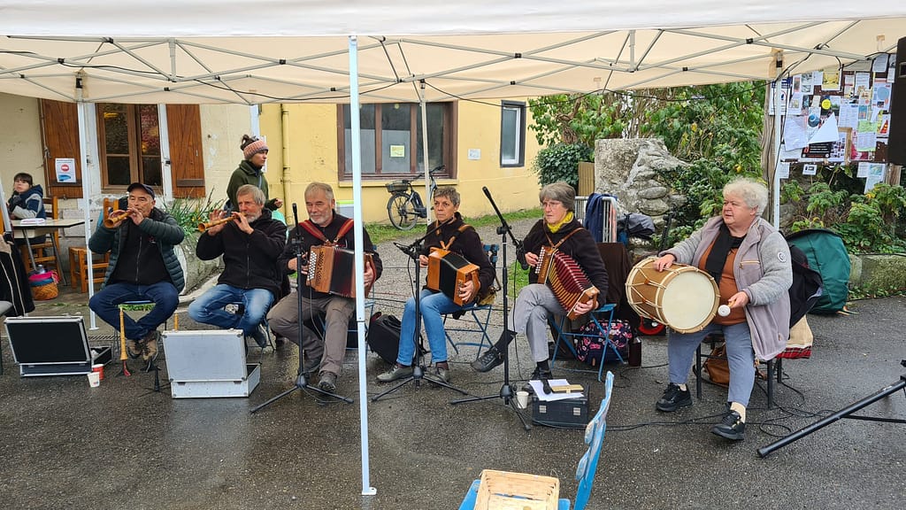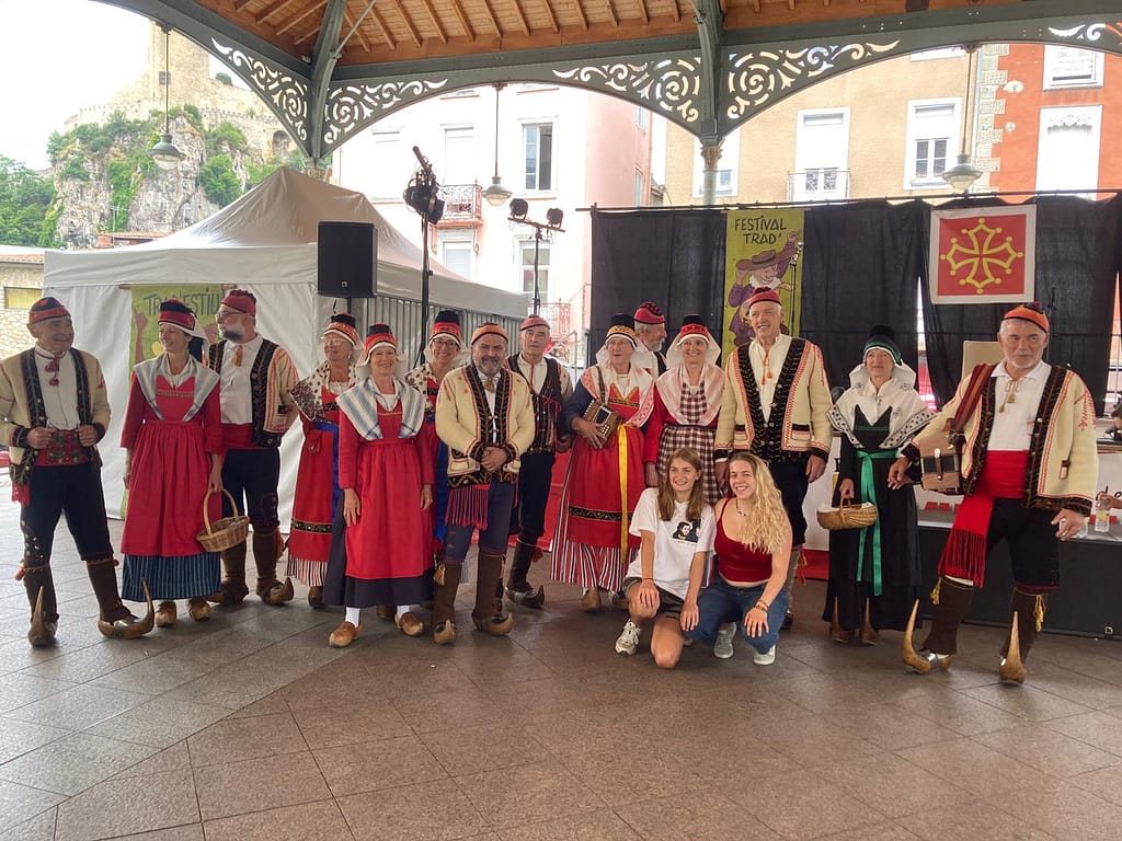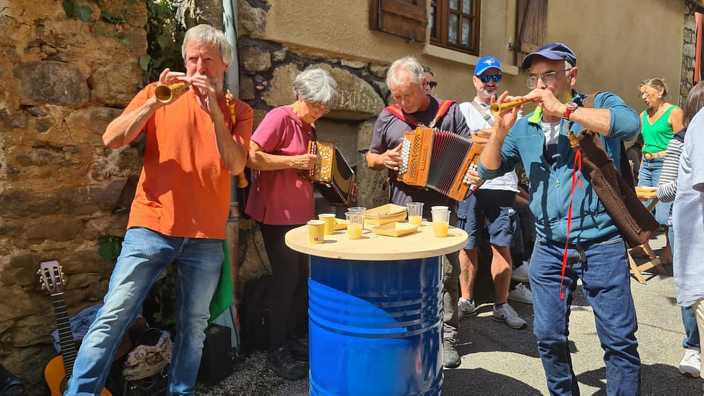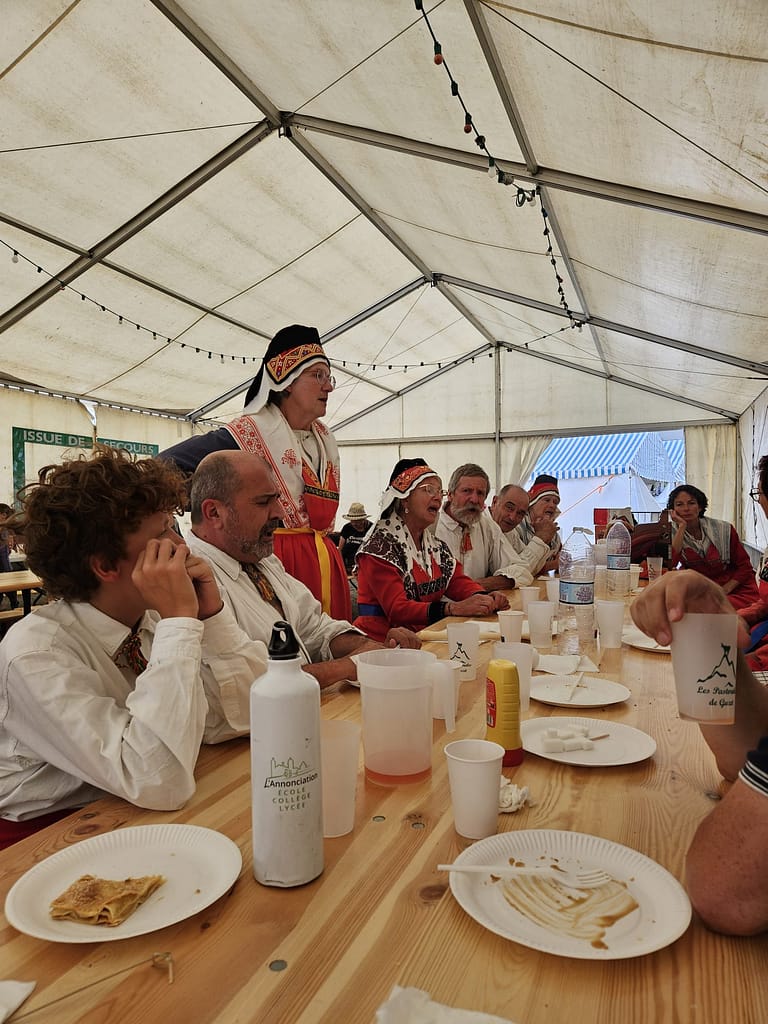 Première rencontre avec « la joie Errante », compagnie de théâtre associée au projet : « Identités Ruralités » (cycle de résidences de territoire) porté par les Scènes Nationales d’Aubusson et de Foix ainsi que par le théâtre d’Aurillac. C’est par l’intermédiaire de l’Estive (la scène Nationale de Foix) que nous les avons rencontrés en début d’année 2025. La compagnie travaille à partir d’échanges avec les habitants et les acteurs du territoire. Elle se sert de la parole recueillie pour produire des pièces de théâtre ou autres actions de sortie de résidence données dans les sites visités, en s’adaptant au cadre. Après ce premier contact établi avec certains d’entre nous, depuis, la compagnie poursuit ses réflexions et souhaite également prendre part à nos répétitions de danses et de chants. Son objectif est de produire un spectacle à partir des éléments qu’elle aura collectés