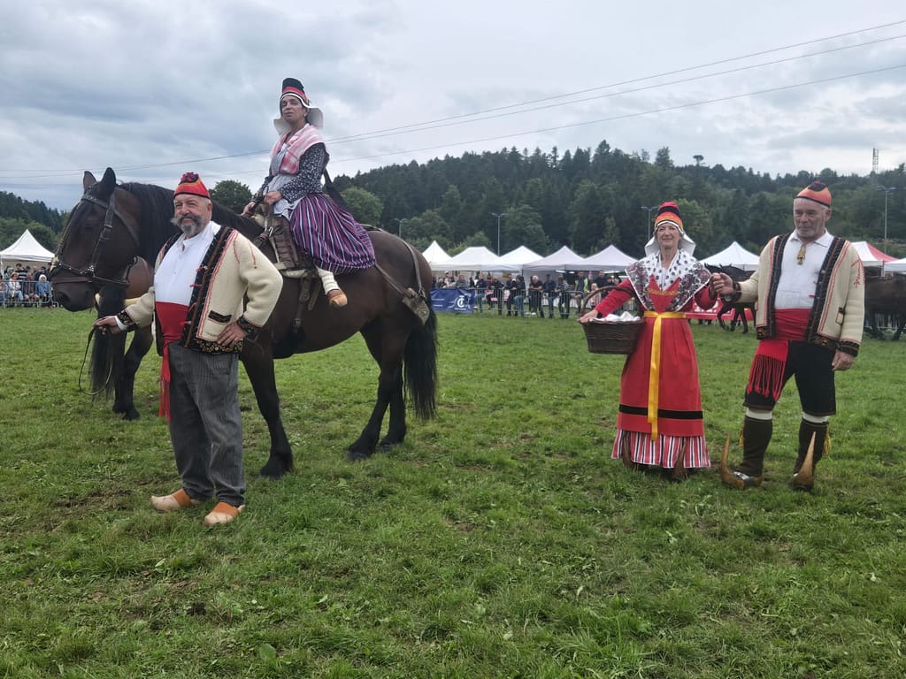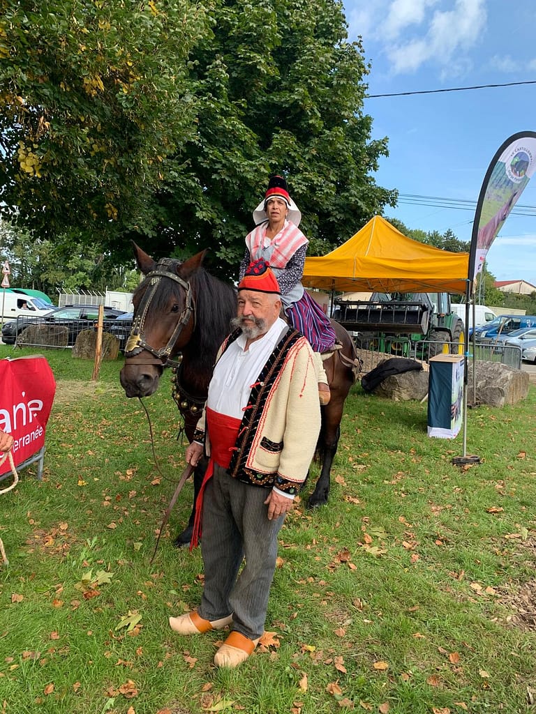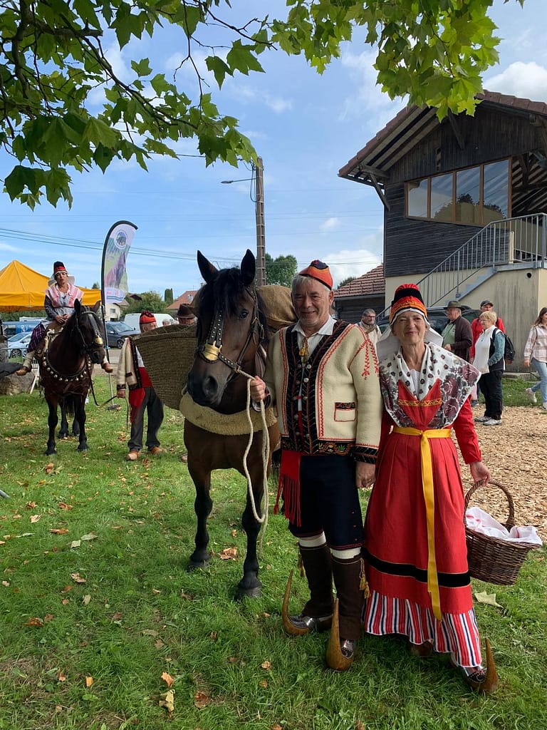 Présence d’un couple en costume qui accompagne l’association du cheval Castillonnais en visite sur une foire aux chevaux de traits à Maiche, dans le Doubs.