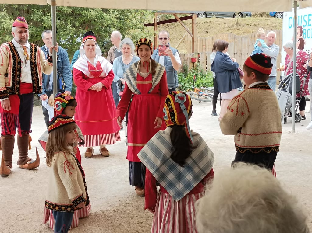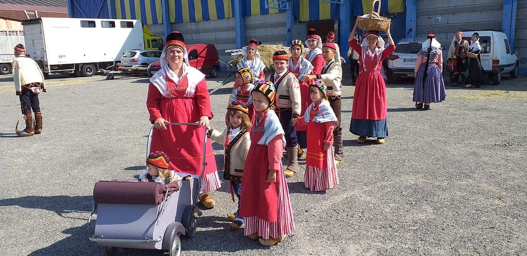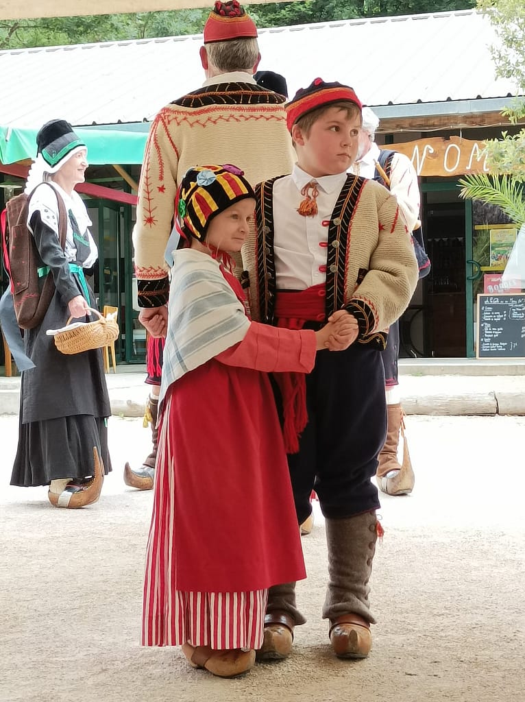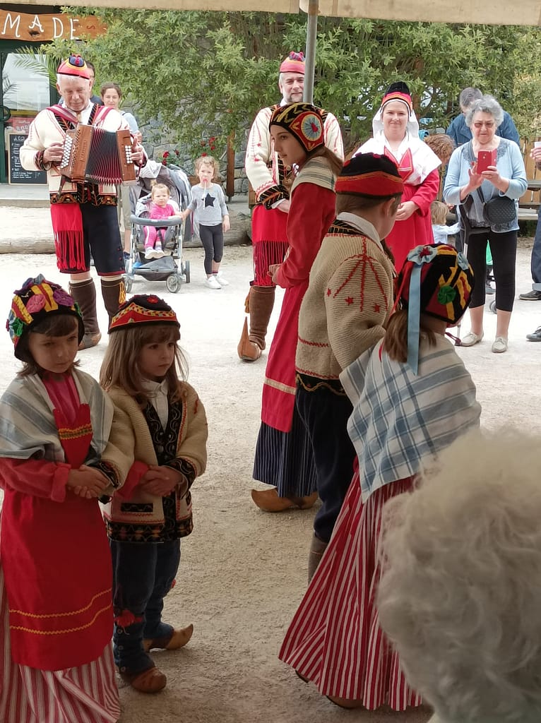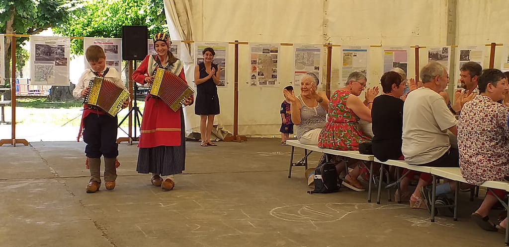 Animation de la fête des traditions : défilé sur le site du marché artisanal, chants et danses pendant l’apéro et le repas puis spectacle dans l’après-midi. Luna et Guilhem (11 et 10 ans) se sont distingués en jouant de l’accordéon pendant le défilé et le repas.