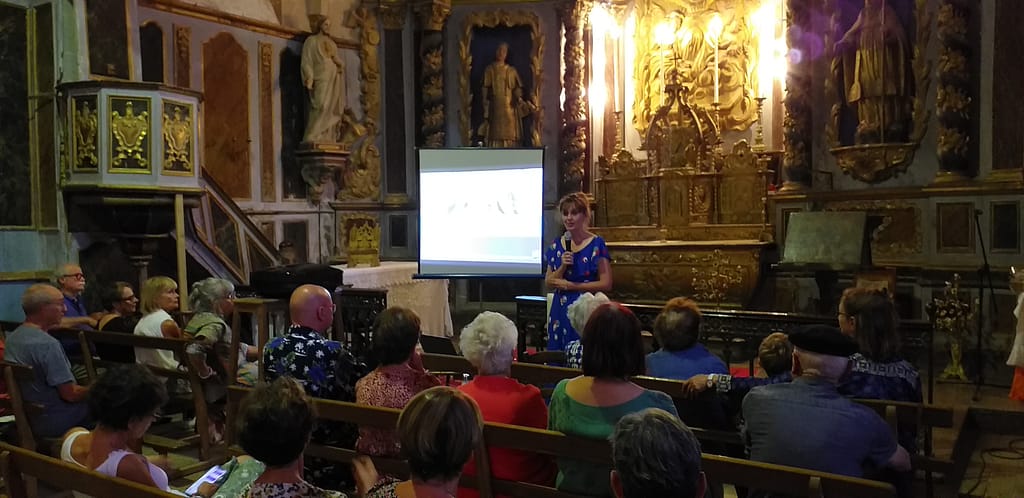 Conférence dans l’église d’Ayet sur le thème des retables baroques donnée par Pauline Chaboussou, conservatrice des antiquités et objets d’art. Animation organisée au profit des travaux de restauration de l’église, en annonce de la fête locale du weekend. Les deux heures d’explication sont passées très vite grâce aux compétences, à la simplicité du propos et au diaporama très dynamique proposés par Pauline, elle aussi est venue bénévolement pour contribuer aux travaux de l’église. L’assistance a été ravie par toutes ses explications.