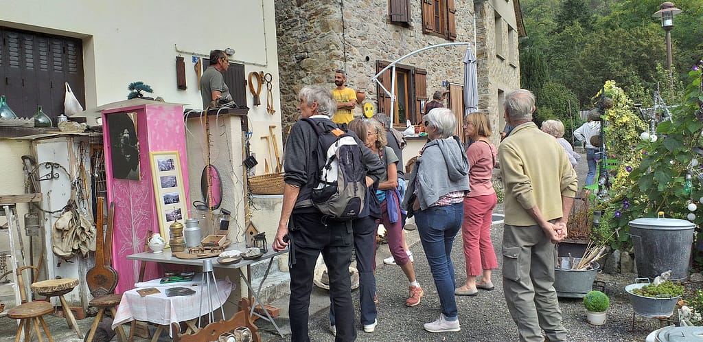 La Bethmalaise a aussi organisé des visites guidées des villages d’Ayet (le samedi) et de Samortein (le dimanche) avec l’aide précieuse et l’investissement de trois habitants particulièrement motivés. A Ayet, quelques habitants se sont mobilisés pour mettre en scène de nombreux objets et costumes anciens. Agrémentée des commentaires du guide mais aussi d’autres habitants présents à la visite, ces deux heures passées à découvrir le village ont été très riches d’enseignements de toute sorte, d’anecdotes et d’histoires qui ont beaucoup intéressé l’assistance.